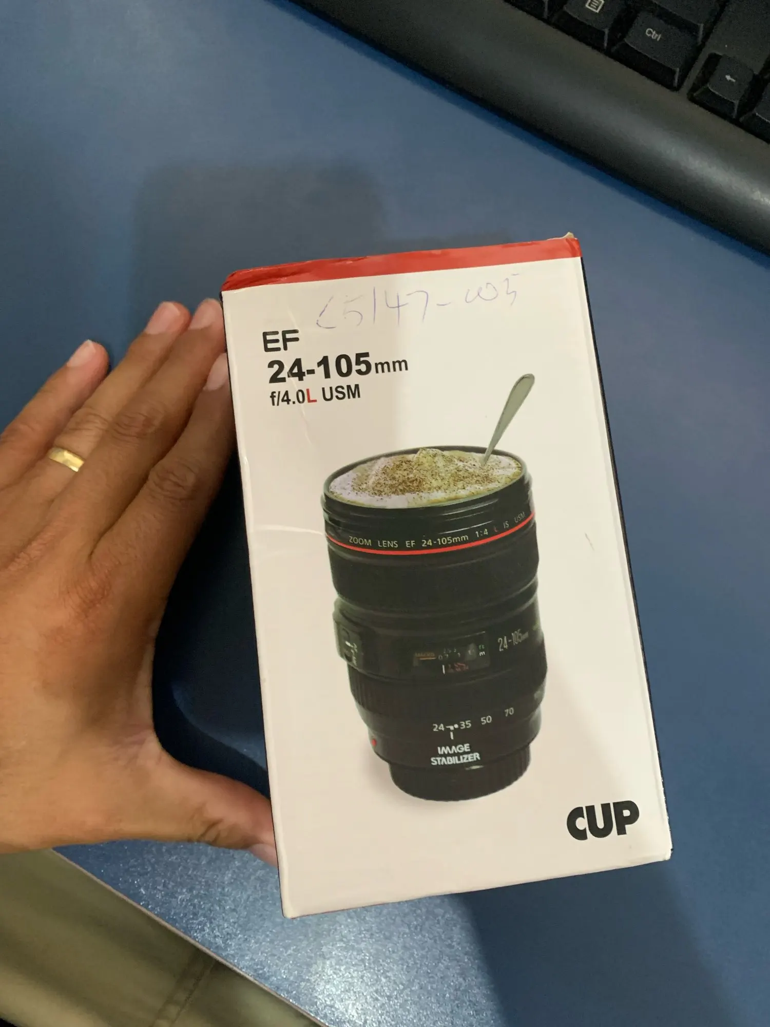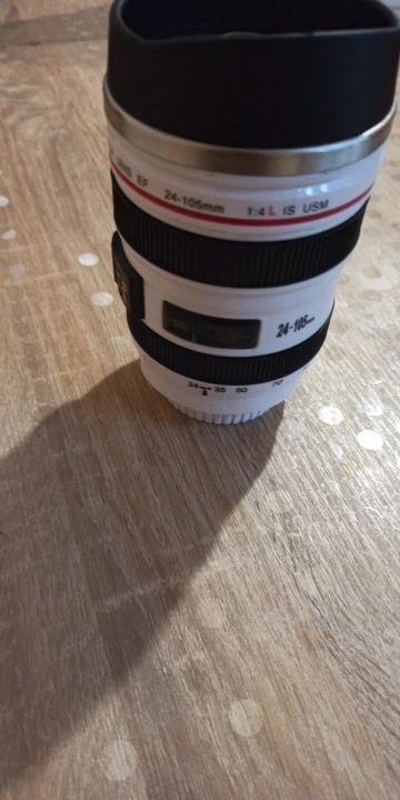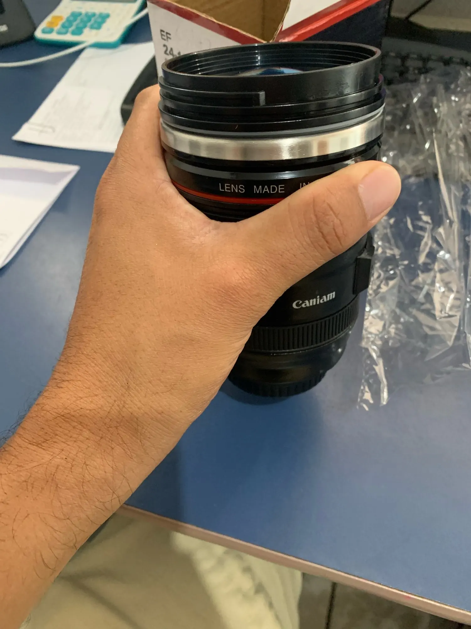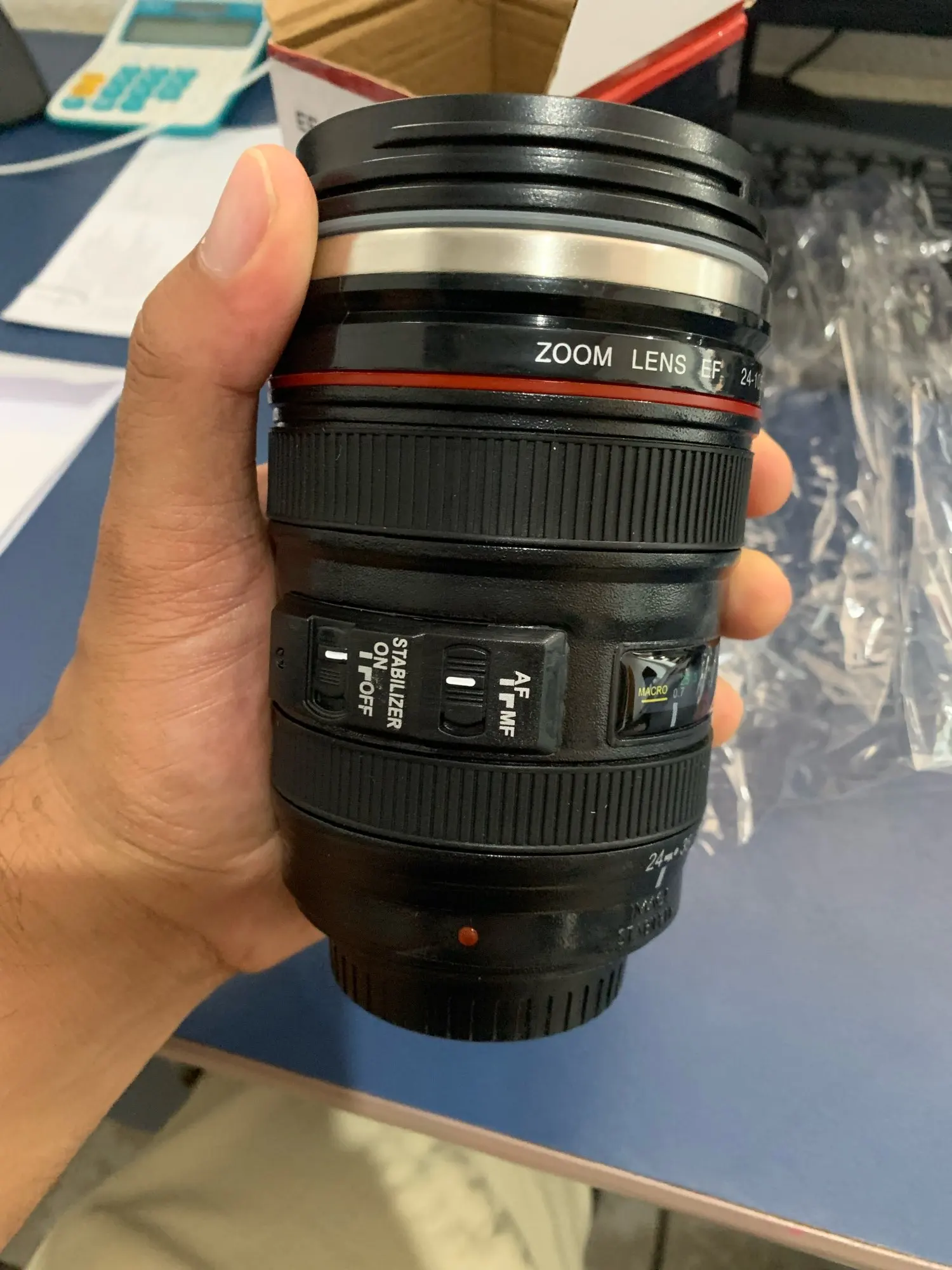 Camera cup has a realistic camera lens look with detachable lens cover lid.